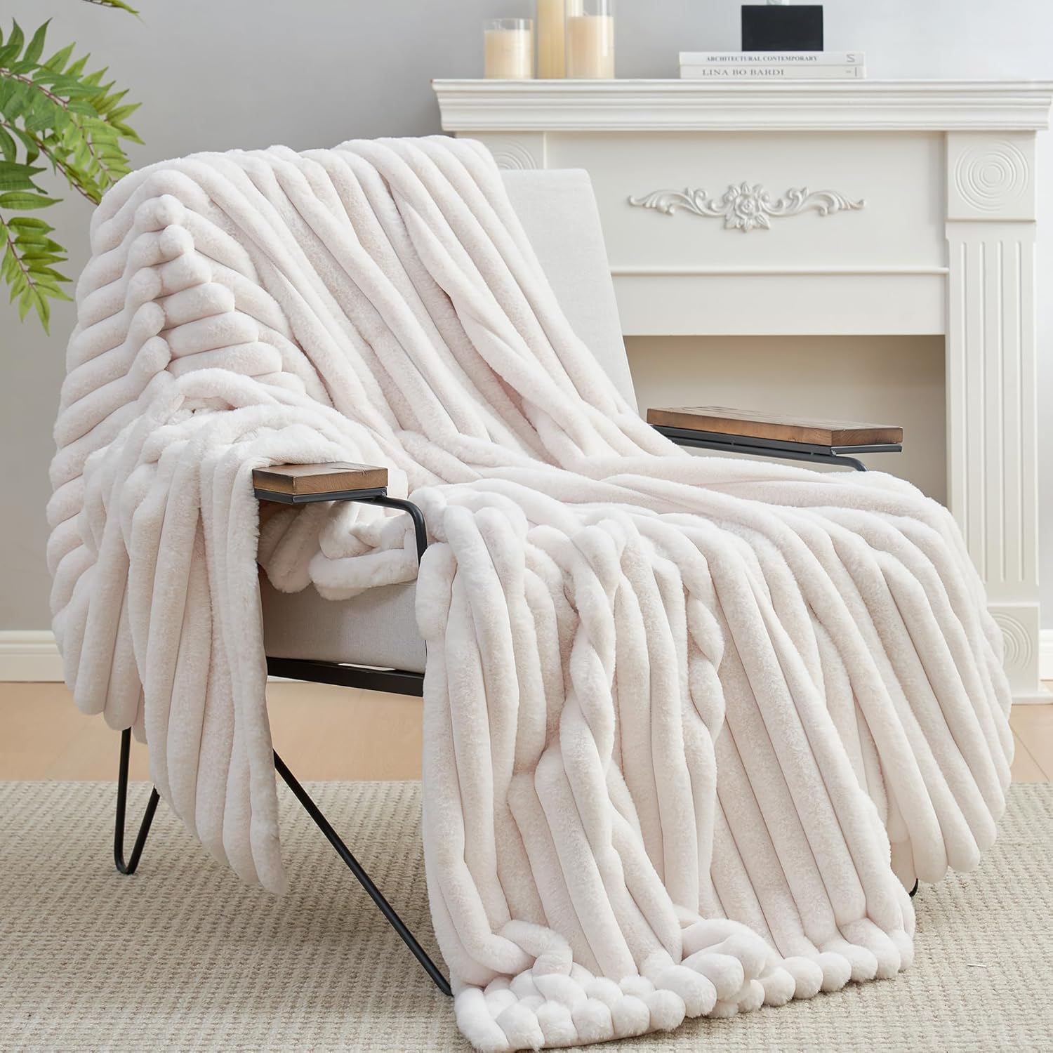Amélie Home Faux Fur Throw Blanket for Couch, Cozy Fuzzy Fluffy Fur Luxurious Soft Striped Plush Gift Blankets for Family Sofa Chair Bed Living Room Bedroom, 55″x70″, Ivory